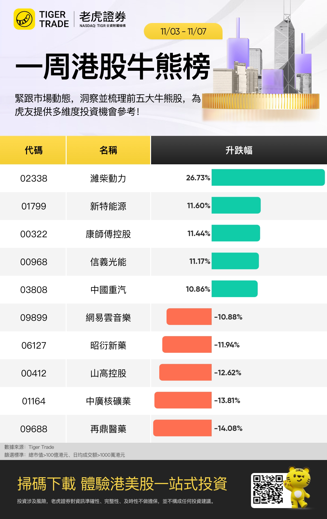 潍柴动力 (2338.HK )本周累升26.73%,重卡行业景气旺盛叠加新业务高增,公司三季度业绩亮眼