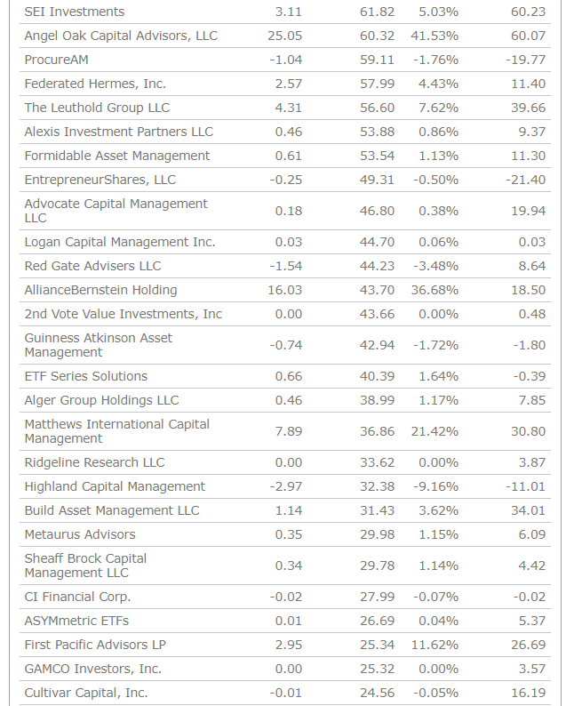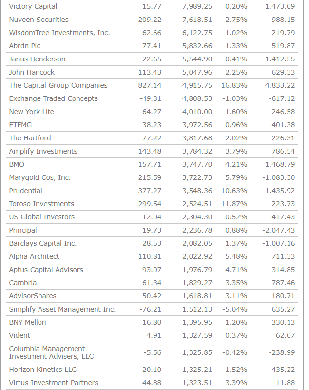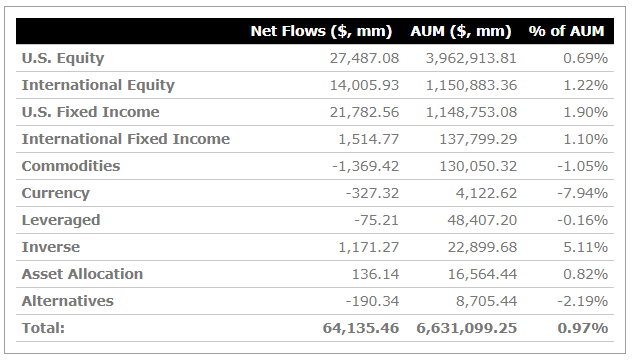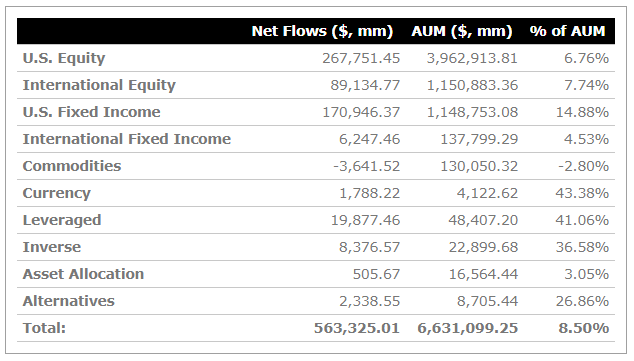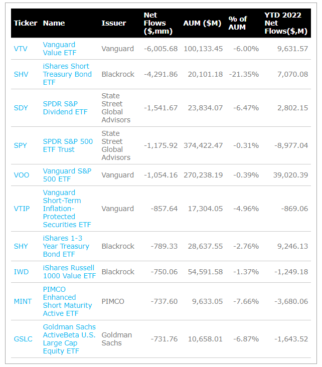 美国股票ETF 带来了 270 亿美元的流入,几乎是上个月 530 亿美元的一半。流出量最大的基金包括SPDR S&P 500 ETF Trust (SPY)、Vanguard S&P 500 EETF (VOO)$、iShares Russell 1000 Value ETF (IWD)