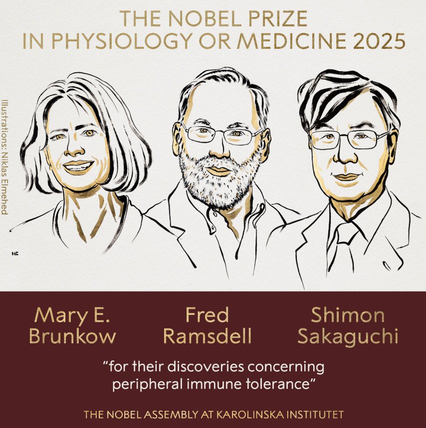 瑞典卡罗琳医学院当地时间10月6日宣布,将2025年诺贝尔生理学或医学奖授予科学家玛丽·E·布伦科(Mary E. Brunkow)、弗雷德·拉姆斯德尔(Fred Ramsdell)和坂口志文(Shimon Sakaguchi)。以表彰他们在外周免疫耐受方面的发现。