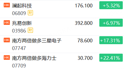 3月5日,港股存储概念盘初走高,南方两倍做多海力士涨超22%,南方两倍做多三星电子涨超17%,兆易创新涨近7%,澜起科技涨超5%。
