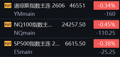 3月26日,美股三大股指期货集体走低,截止发稿,道指期货跌0.34%,纳指期货跌0.45%,标普500指数期货跌0.38%。