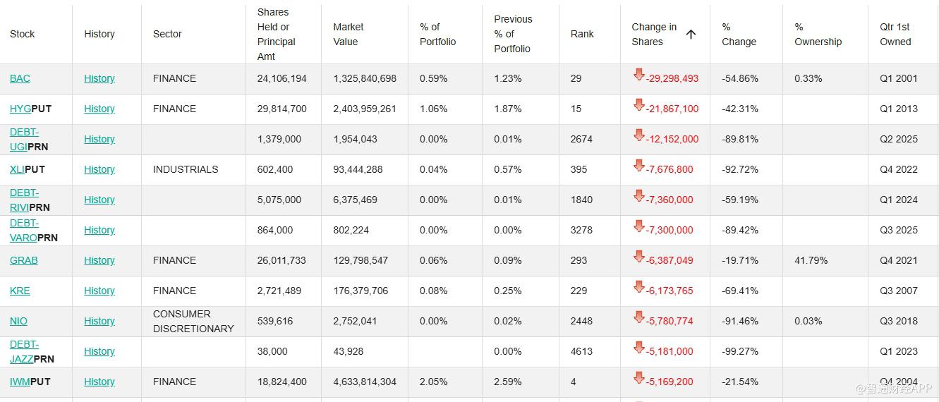 在减持操作上,花旗第四季度对多项金融股、指数及期权类资产进行了明显削减。数据显示,花旗大幅减持美国银行,持股数量减少约2929万股,降幅达54.86%,其在投资组合中的占比由上一季度的1.23%降至0.59%。