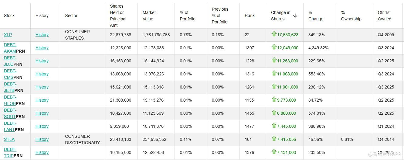 从增持情况来看,花旗在第四季度对部分ETF及债务类工具进行了较为明显的加码操作。其中,必需消费品ETF成为加仓幅度最大的标的,持股数量增加约1763万份,持仓占比由上一季度的0.18%大幅提升至0.78%。