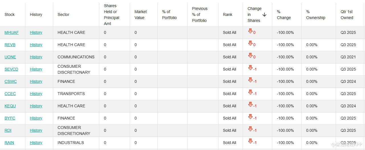 与此同时,花旗在第四季度对部分小市值及流动性较低的个股进行了完全清仓处理。被清仓的标的主要集中在医疗保健、可选消费、金融及工业板块,包括美华国际、Revelation Biosciences、基瓦尼科技、百老汇金融、西南资本、Reading International-A、Rain Enhancement Technologies等个股,相关持仓在本季度均已降至零。