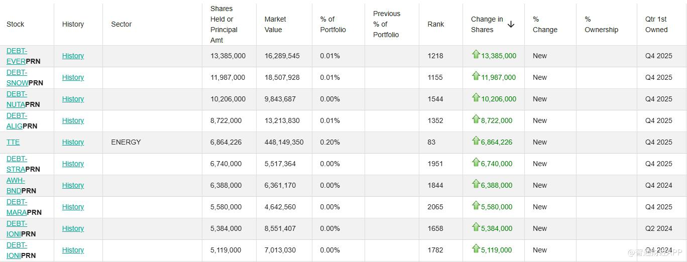 从新建仓情况来看,花旗在第四季度新增了多项债务类及可转换证券相关持仓。其中,新纳入的标的包括西星能源、Snowflake、Nutanix、艾利科技、Mara Holdings、IonQ Inc等公司的相关债务或优先证券,单一标的新增规模普遍在大约500万至1300万份区间,整体占投资组合比例相对有限。