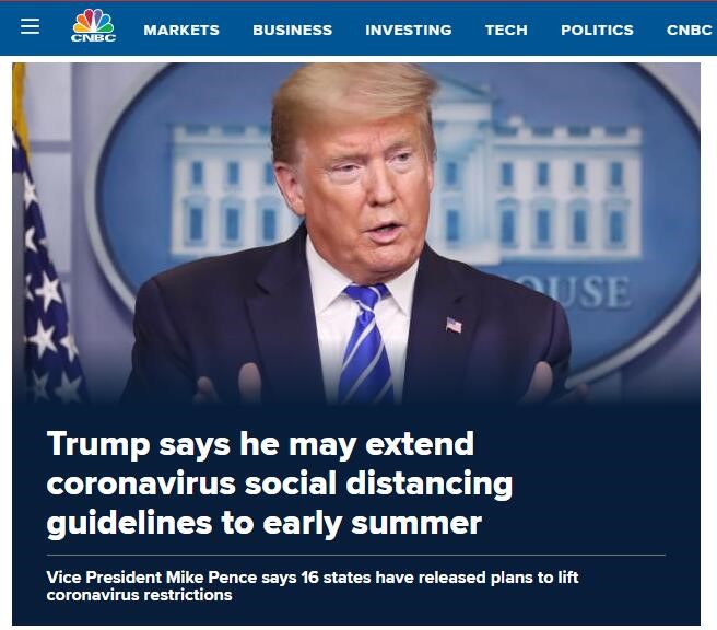 CNBC:特朗普称可能将社交隔离指引延长到今夏初