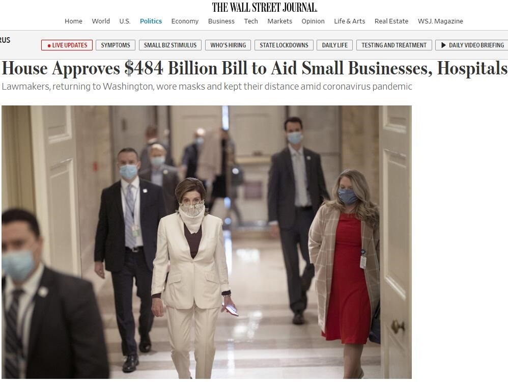 华尔街日报:美国众议院批准4840亿美元“抗疫”议案资助小企业和医院
