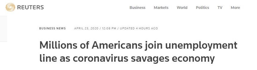 路透社:新冠肺炎疫情冲击经济美国一个月增加失业人口2600多万