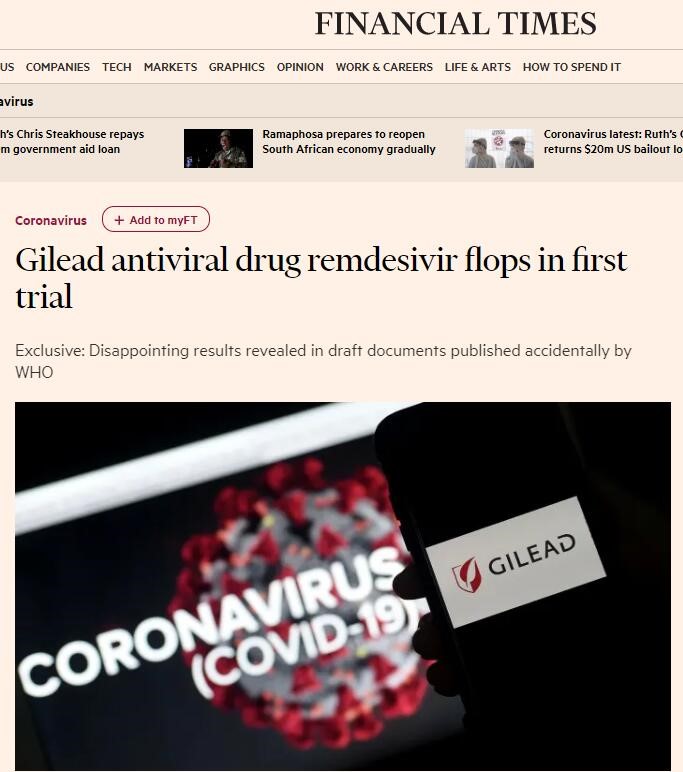 金融时报:吉利德科学药物瑞德西韦的首次试验失败