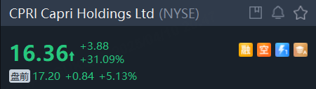 Capri Holdings盘前涨超5%,据彭博报道,普拉达同意将以13.75亿美元收购范思哲。