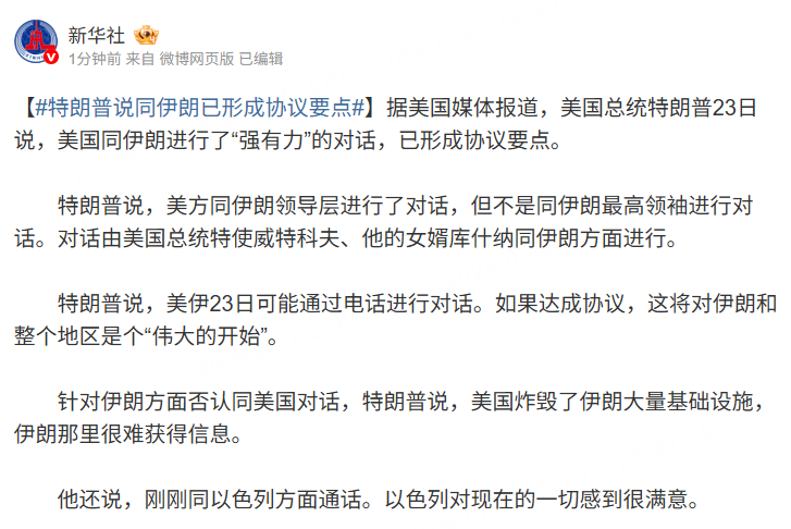 新华社消息,据美国媒体报道,美国总统特朗普23日说,美国同伊朗进行了“强有力”的对话,已形成协议要点。