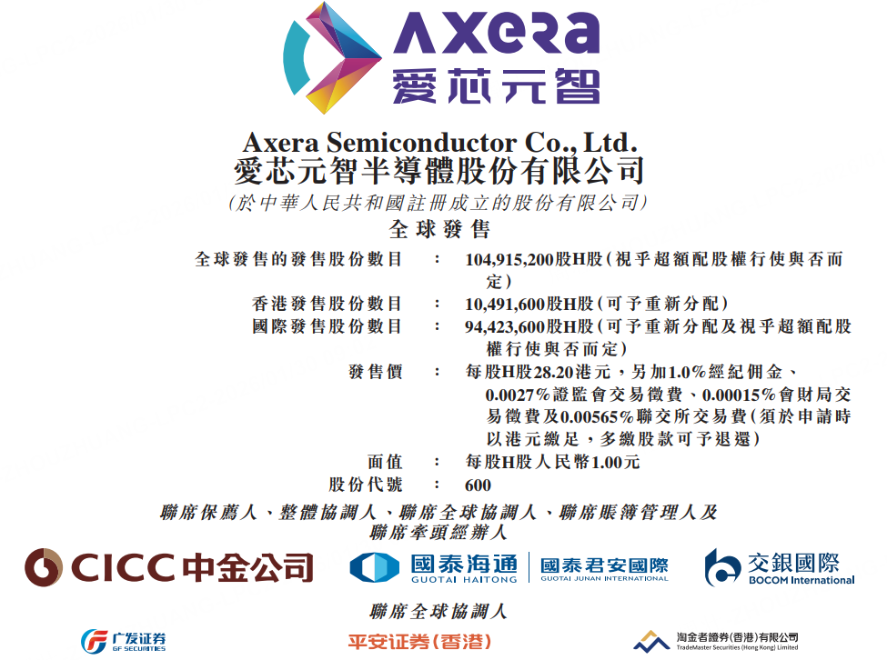 1月30日,爱芯元智发布公告,于1月30日至2月5日招股,公司拟全球发售1.05亿股,每股发售价28.2港元,每手100股,入场费2848.44港元,中金公司、国泰君安国际及交银国际为联席保荐人,预计将于2月10日开始在港交所挂牌交易。