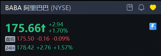 截至发稿,阿里巴巴夜盘涨幅近1.6%。