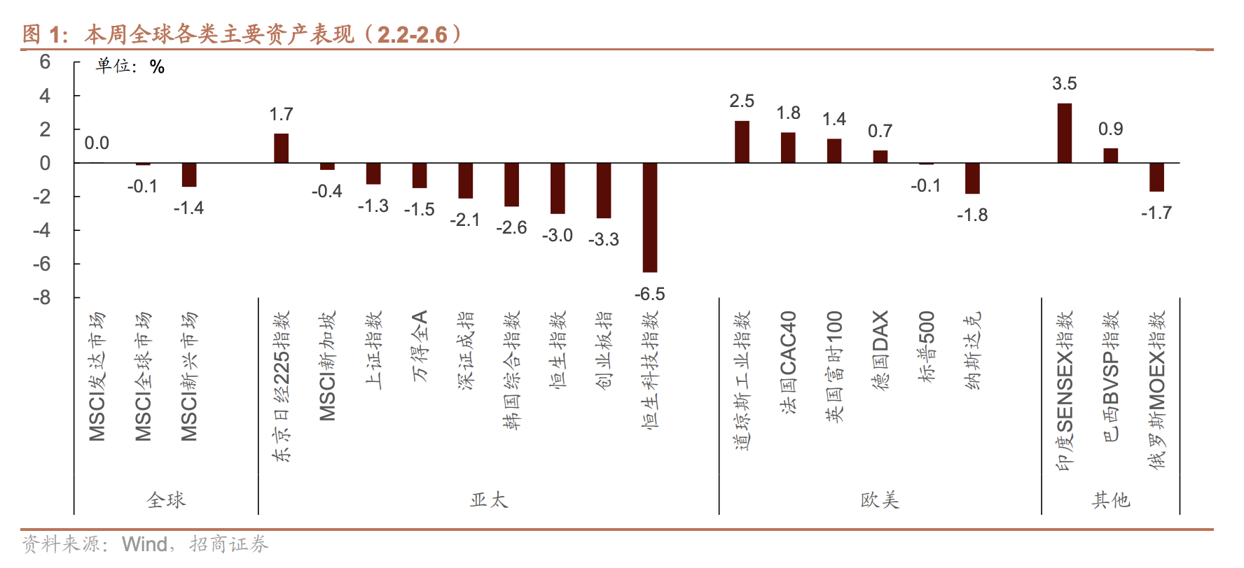 在1月30日特朗普宣布提名沃什为新一任联储主席后,对沃什可能偏鹰派货币政策的担忧冲击市场情绪,过去一周沃什交易成为市场主旋律,美元指数继续反弹,新兴股票市场重挫。具体来看,对海外流动性最为敏感的港股市场领跌,尤其恒生科技指数跌幅超过6%;相比之下欧洲股市、美股的道琼斯指数逆势上涨,而美股科技股跌幅居前。