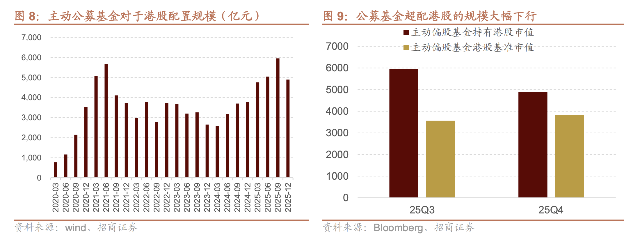 这一叙事在当前得到极大缓解。2025年四季度,主动基金减配港股,截至25Q4公募基金对于港股的配置规模下降至4897亿元;同时公募基金对于港股配置的基准市值有所回升,公募基金对于港股的基准配置规模上行至3817亿元,公募基金超配港股的规模显著缩小。往后看去,超越基准导致的净卖出或将告一段落。