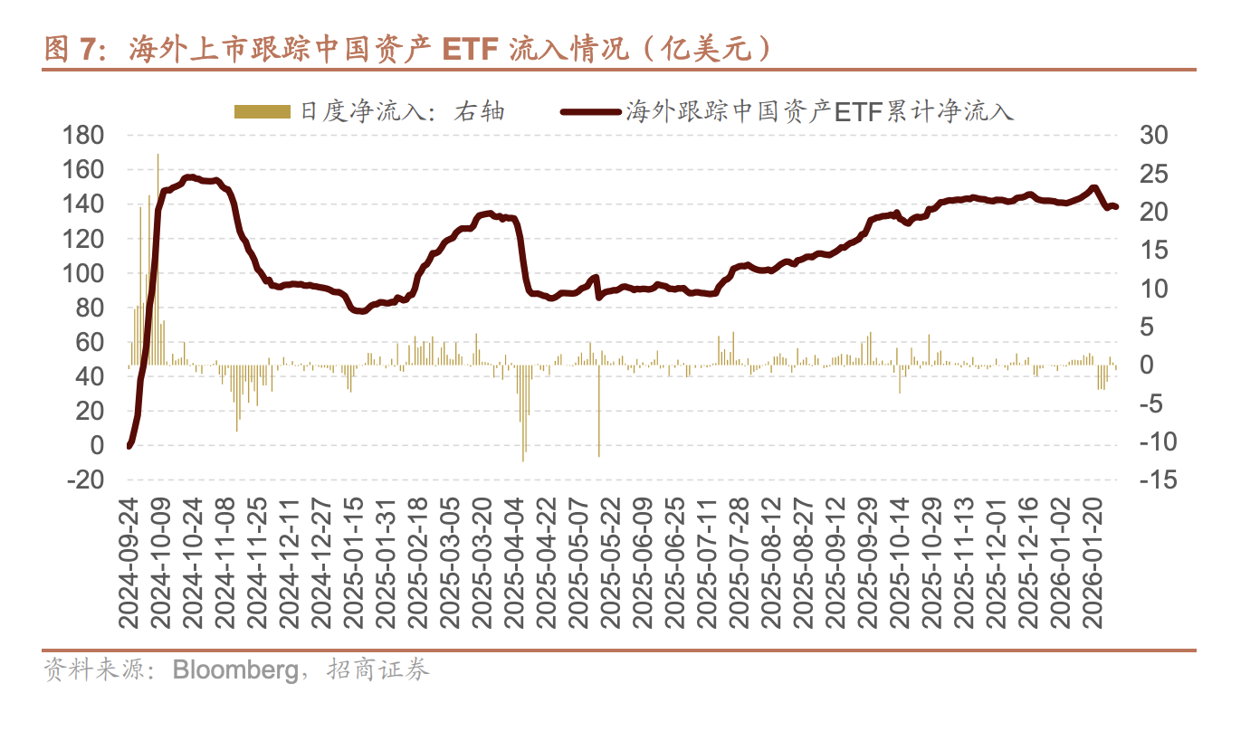 从微观流动性角度来看,外资不断流入。海外上市、跟踪中国资产的ETF自2025年7月以来不断流入,累计净流入规模超140亿美元,而过去两年外资流入的高峰分别为24年9月政策转向与25年3月DeepSeek时刻,但当时有明显的快进快出特征。最新一轮缓慢、持续的净流入,验证了中国市场从“可交易”向“可投资”的转变。