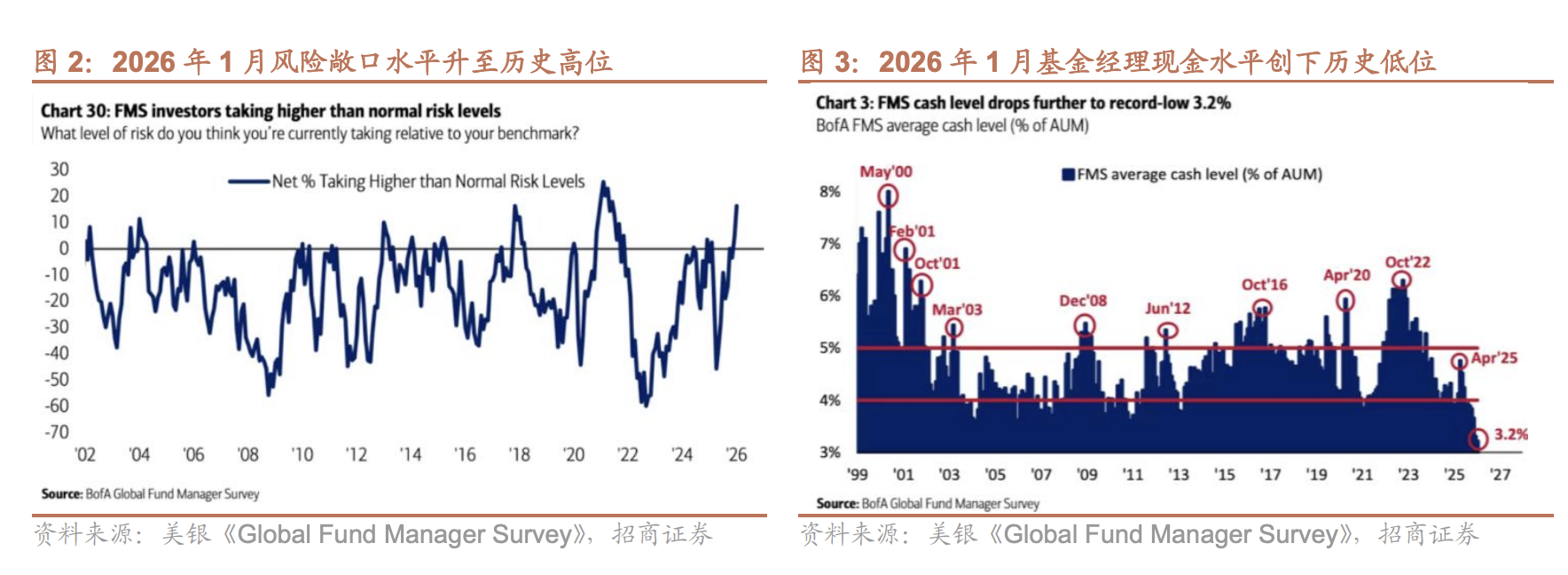 沃什主张的“缩表+降息”可以概括为相对鹰派的宽松态度,理论上将在中长期有利于稳定美元,这对此前市场广泛交易的“弱美元”叙事形成挑战,而全球资本市场已经计入了太多的弱美元和流动性宽松预期,从而增加了市场的脆弱性。一个直观的表现就是全球各类资产表现正相关性提升,风险资产、避险资产齐涨齐跌,全球风险敞口极高,而现金持有水平降至历史低位。根据美银在1月20日发布的全球基金经理月度调研结果,受调研的基金经理风险敞口水平净高出正常水平16%,仅次于2021年高点;且现金持有水平进一步下降至3.2%,为2000年以来的历史最低水平,这些指标都表明在经济好转+通胀担忧缓解+美元走弱的预期组合下,市场整体情绪达到了历史性的极度乐观水平。