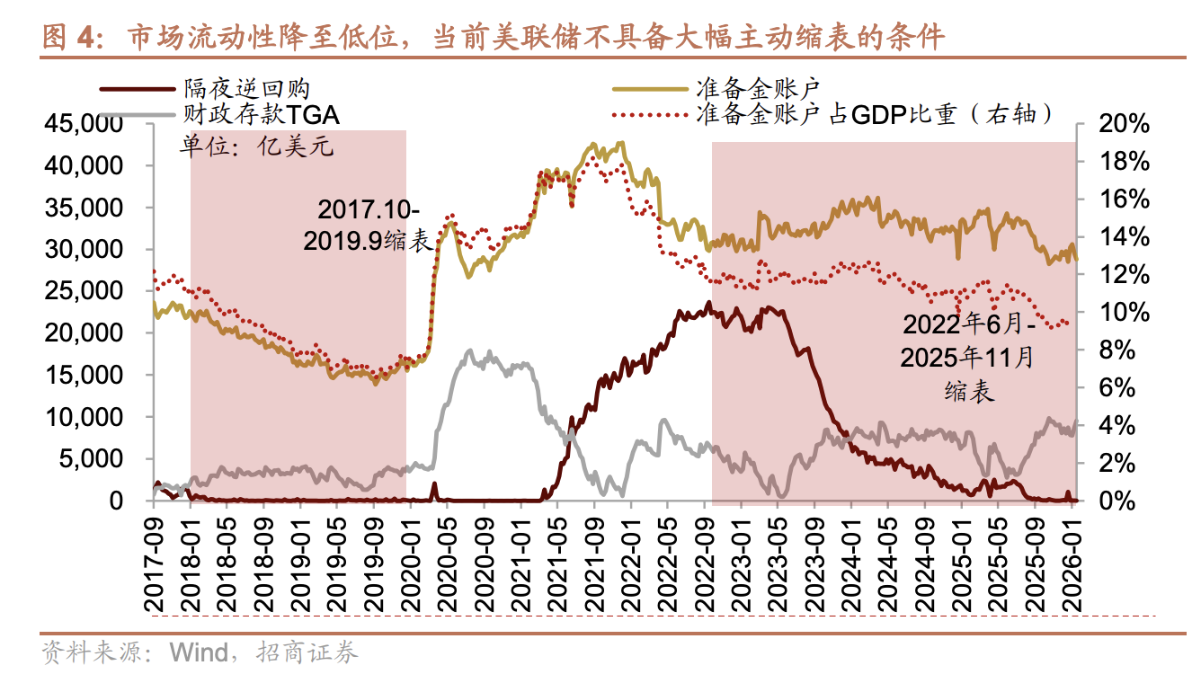 政策层面,沃什的上任能否从根本上打破货币贬值交易的逻辑仍存在较大的不确定性,缩表的推进也面临现实性的阻碍,降息在前,缩表在后。在市场对前期高度一致预期和过热交易进行纠偏后,投资者回归冷静,可能重新审视弱美元交易逻辑被打破的不确定性,而将短期交易重点重新放在对降息的预期上。第一,在经历连续的缩表后,当前美联储准备金账户规模已经降至2.88万亿美元,占GDP比重降至9%左右水平;隔夜逆回购规模仅11亿美元。继续缩表将直接抽离银行体系的核心流动性,极易重现2019年的货币市场动荡。第二,若要推进缩表,需要有机构来承接美联储资产端的美债,而当前银行机构在补充杠杆率SLR等指标的约束下,进一步增持美债的能力有限,有待于放松监管后释放其持债空间。
