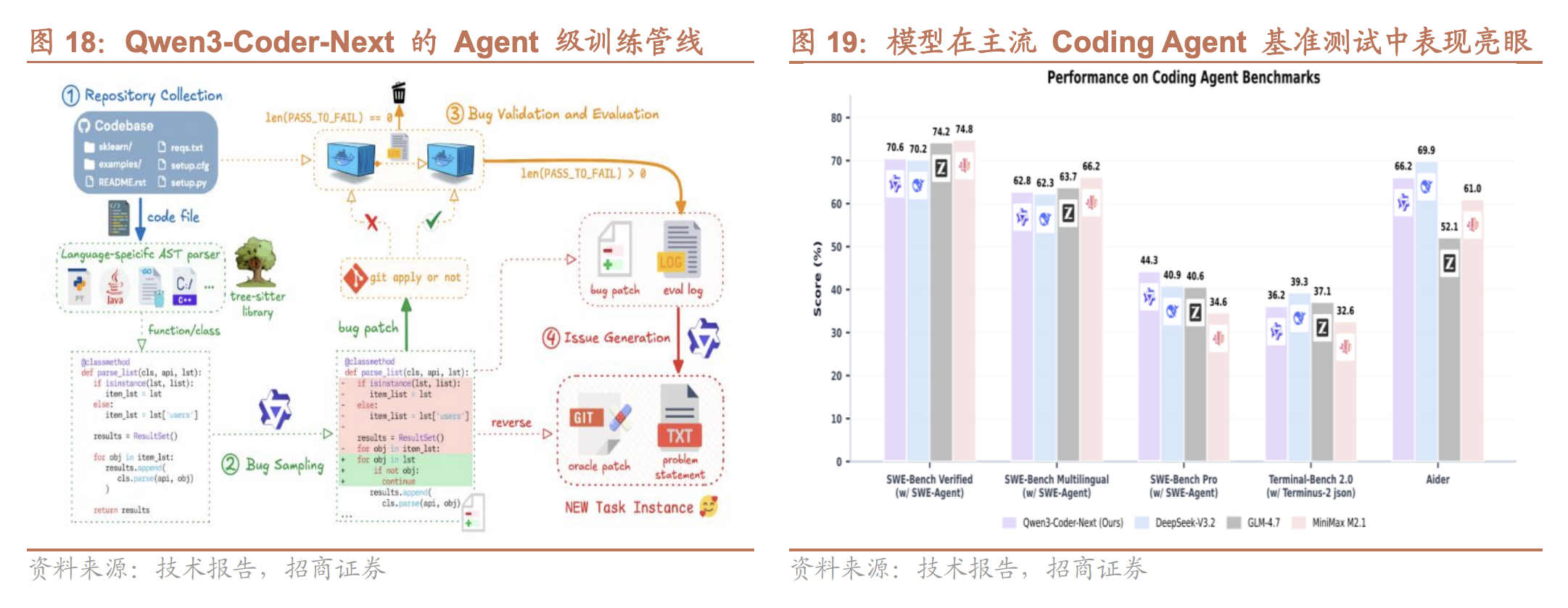 在权威编程智能体基准测试中,Qwen3-Coder-Next展现出卓越性能。使用SWE-Agent框架时,该模型在SWE-BenchVerified上达到70%以上的问题解决率,在多语言设置及更具挑战的SWE-Bench-Pro基准上同样保持竞争力。尽管激活参数规模很小,该模型在多项智能体评测中的表现能够匹敌或超过激活参数量大10-20倍的稠密模型,包括37B激活参数的DeepSeek-V3.2和32B激活参数的GLM-4.7等。