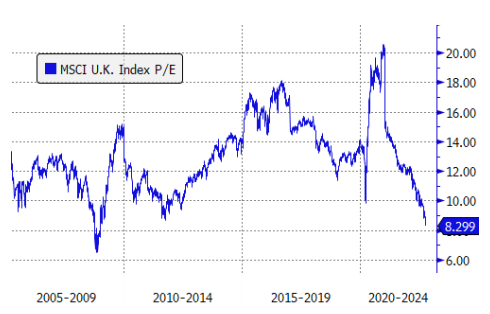 但英国股票的估值比美国股票便宜得多。根据彭博社的数据,MSCI英国指数的远期市盈率为 8.2,而标准普尔 500指数为 15.4。