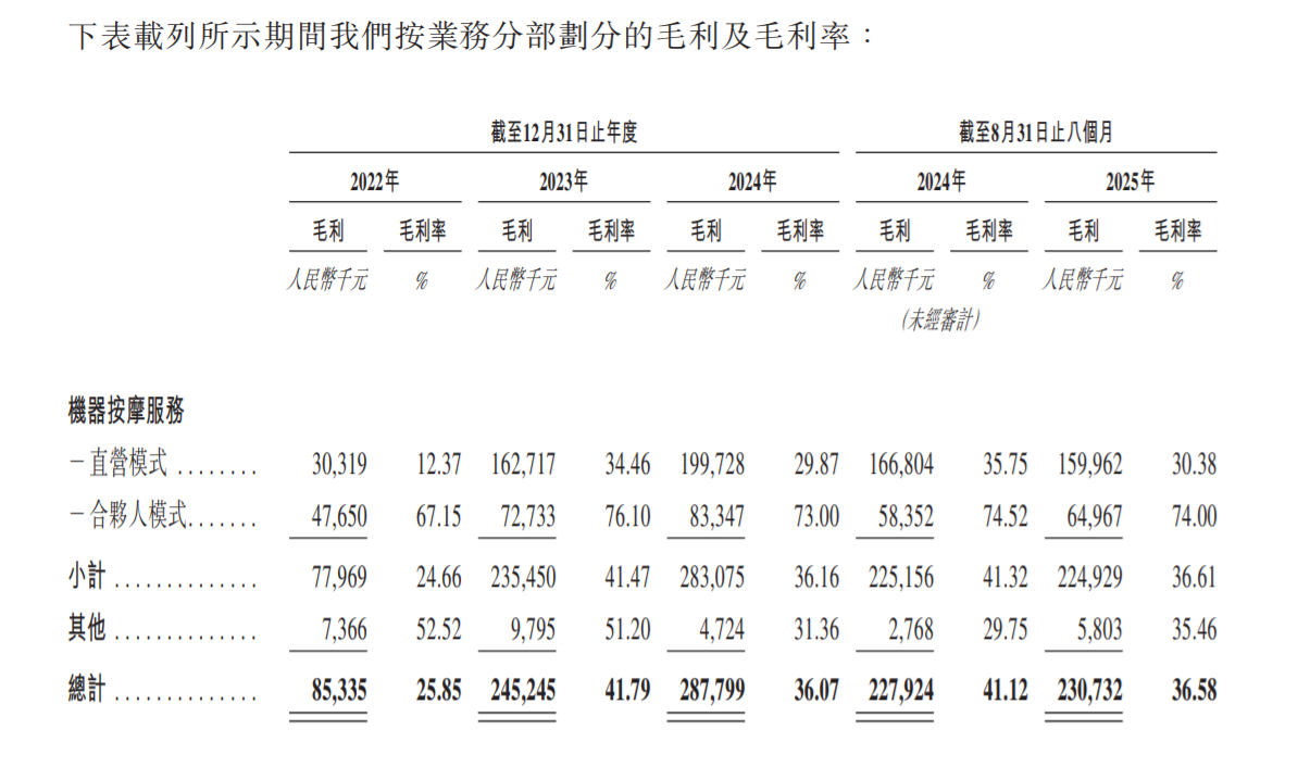 而之所以能成为行业龙头,得益于乐摩科技“直营+城市合伙人”的经营模式以及对高人流区域的重点布局。据招股书显示,在经营模式上,乐摩科技采用了“直营+城市合伙人”双线并行的经营模式,这让公司在减少重资本投入的同时,能有效地扩大在全国的业务覆盖范围。截至2025年11月25日,乐摩科技已设立超过4.8万个服务点,投放超过53.3万个机器按摩设备,覆盖中国31个省级行政区及337个城市,其中约70.4%的服务网点以直营模式运营,城市合伙人模式占比约三成。