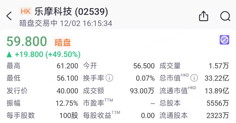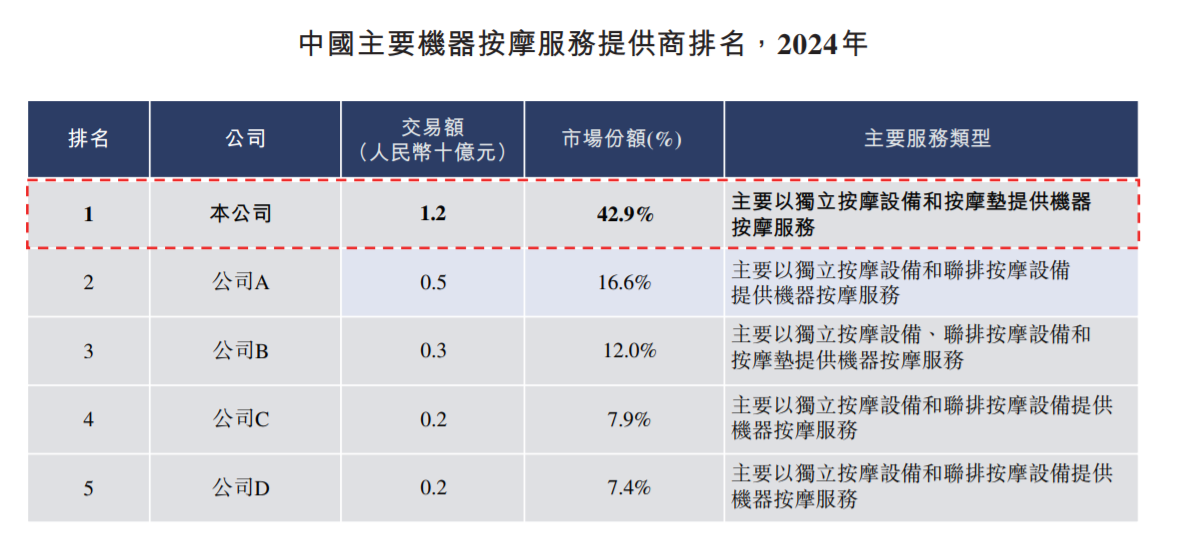 12月2日周二,乐摩科技 开启暗盘,盘初暴涨50%。据弗若斯特沙利文数据显示,若按交易额计算,乐摩科技于2022年至2024年连续三个年度在中国机器按摩服务市场中排名第一位。且若按收入计算,乐摩科技2024年的市场份额位列国内第一名,市场份额超过50%,远超市场中的其他参与者。