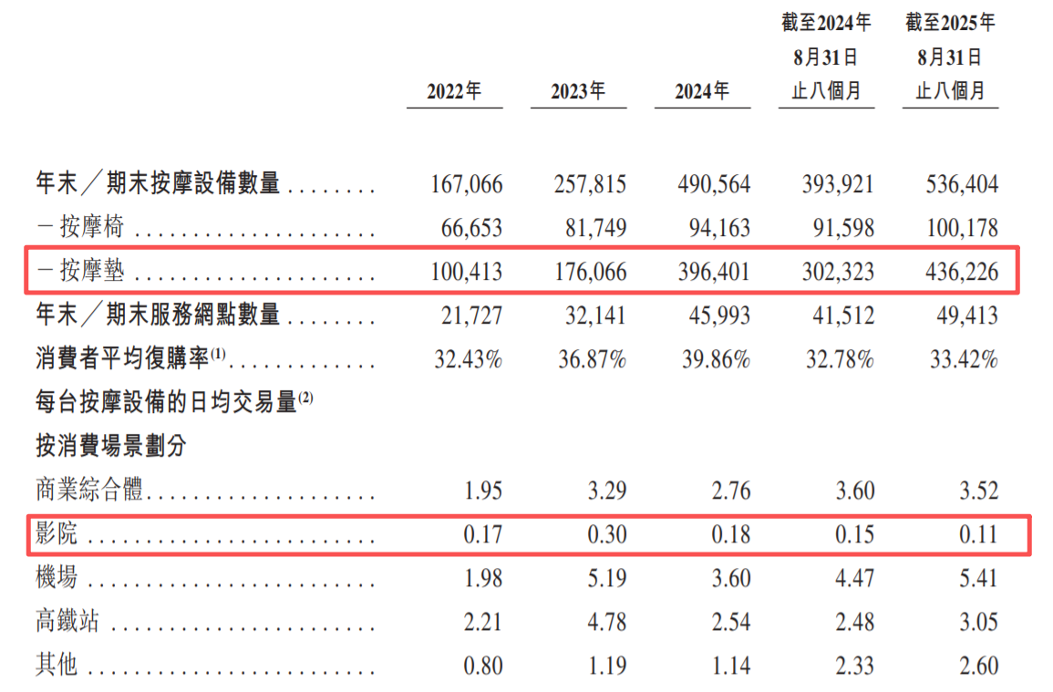 而在2024年中,乐摩科技投放的按摩垫数量占公司总投放设备的占比高达80.8%,而按摩垫的主要投放场景便是影院,这意味着,乐摩科技在日均交易量最低的影院场景消耗了更多的投放资源。乐摩科技在招股书中表示,相较于商业综合体、机场和高铁等场景,影院更容易实现机器按摩服务的规模扩张,这或许是因为影院座椅现成、改造成本较低,且影院方有动力通过合作增加非票收入。