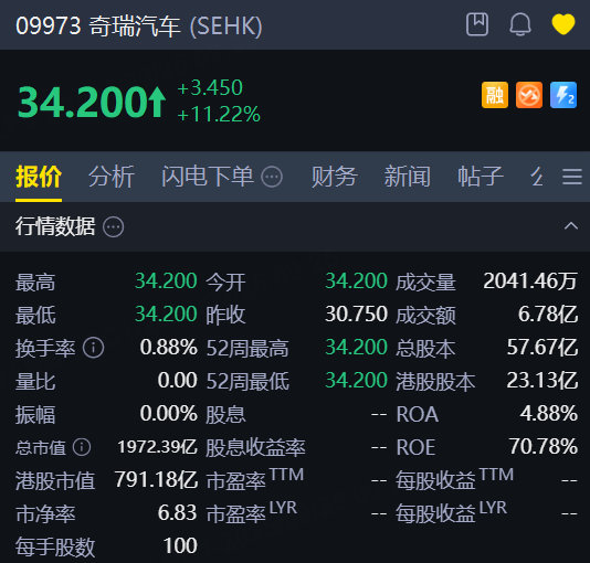 9月25日,奇瑞汽车上市首日大幅高开逾11%,总市值超1972亿港元,中签一手赚345港元;此前公开发售阶段获308.18倍认购,一手中签率0.67%。