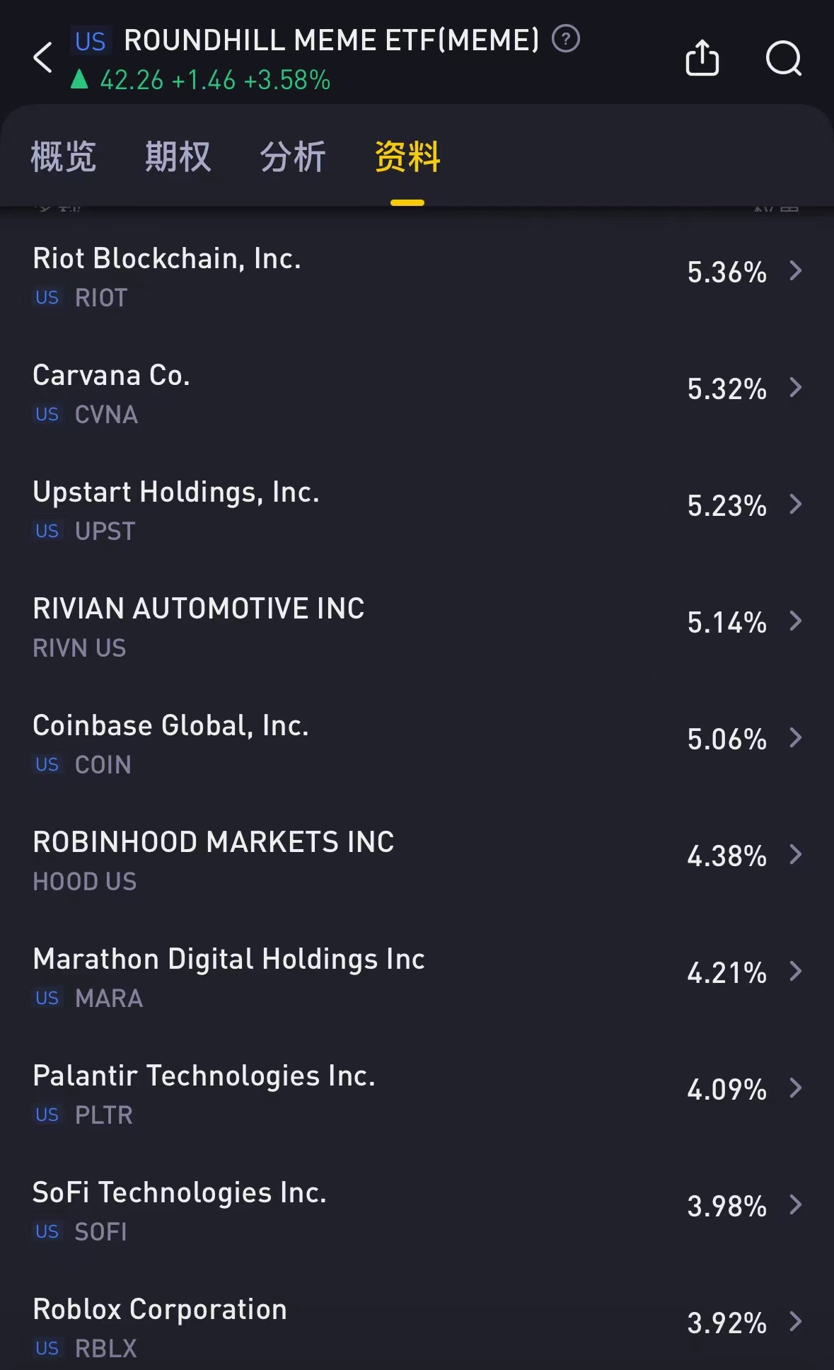 MEME ETF 是一款与 Solactive Roundhill Meme 股票指数挂钩的 ETF,跟踪meme 股票的表现 ,该指数表现出了令人印象深刻的涨幅,今年上涨了 67%。该指数的重仓股是比特币矿商 Riot Platforms,该公司今年已飙升 458%。