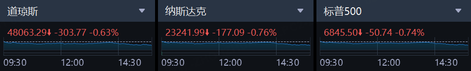 周三,美股市场延续了圣诞节后的回撤行情,三大指数集体收跌,为2025年画上了低调的句号。截至收盘,标准普尔500指数跌0.74%,报6845.5点;纳斯达克综合指数跌0.76%,报23241.99点;道琼斯工业平均指数跌0.63%,报48063.29点。
