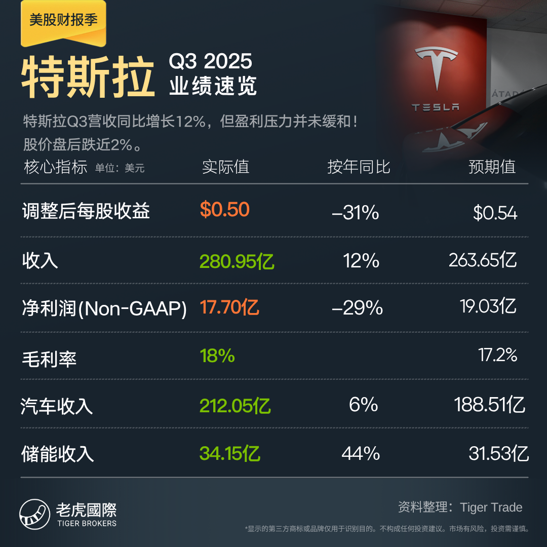 特斯拉三季度营收一扫前一季两位数大跌的颓势,同比两位数大增,而每股收益(EPS)的同比降幅扩大到30%以上,比华尔街预计的下滑更严重,体现了特朗普政府提高关税、特斯拉推出新车型、开发人工智能(AI)项目等研发投入增加的影响。