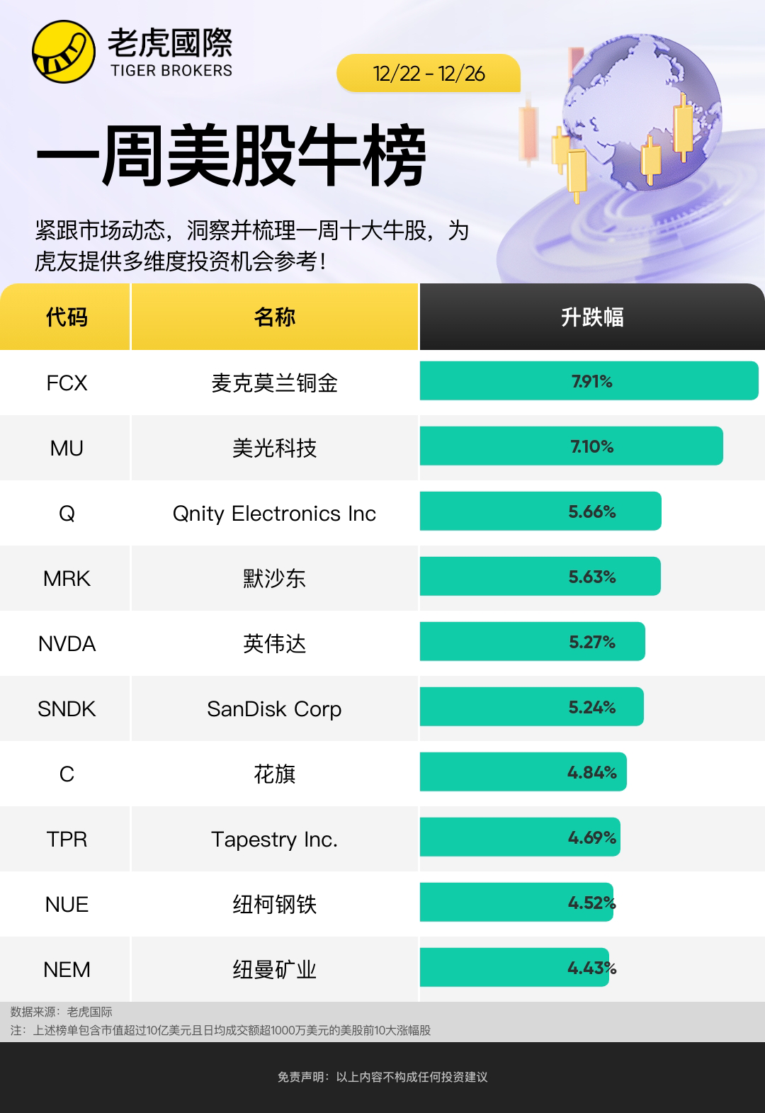 上周哪些股票表现优异?以下是截至12月26日当周,市值超过200亿美元的美股中涨幅前十名: