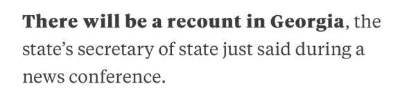 【环球网快讯】彭博社刚刚消息,佐治亚州务卿刚刚在新闻发布会上说,佐治亚州将重新计票。