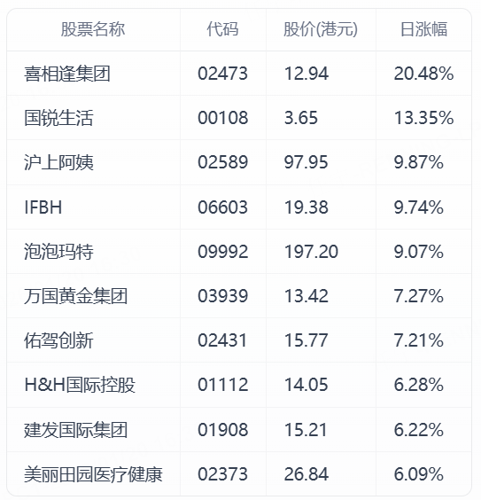 港股今日涨幅TOP10