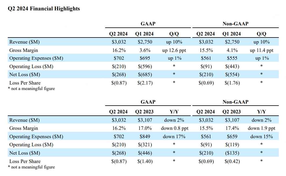 1月25日盘后,西部数据发布2024财年第二季度业绩。财报显示,第二季度营收30.32亿美元,市场预期30亿美元,去年同期31.07亿美元;净亏损2.68亿美元,市场预期净亏损4.83亿美元,去年同期净亏损4.46亿美元;每股亏损0.87美元,市场预期每股亏损1.38美元,去年同期每股亏损1.4美元。