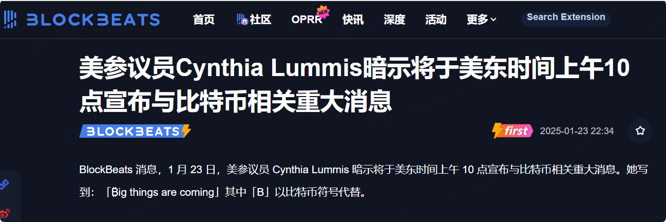 BlockBeats 消息,1 月 23 日,美参议员 Cynthia Lummis 暗示将于美东时间上午 10 点宣布与比特币相关重大消息。她写到:「₿ig things are coming」其中「B」以比特币符号代替。