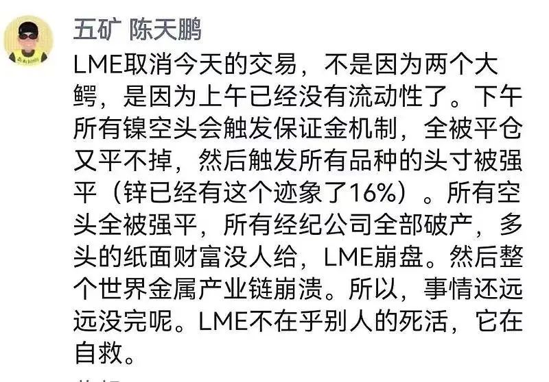 伦敦证交所领先的电子做市商XTX Markets的创始人Alex Gerko在社交媒体上表示,你不能做LME做的事,这是“市场的终结”。