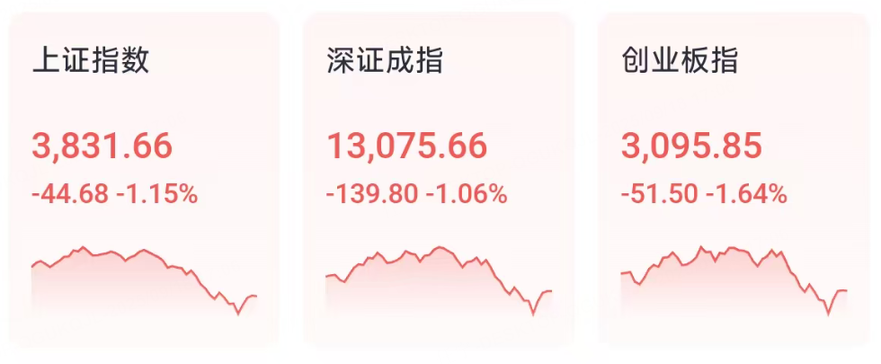 今日A股市场放量下跌,三大指数午后加速跳水,临近尾盘跌幅有所收窄。截至收盘,沪指跌1.15%报3831.66点,深成指跌1.06%报13075.66点,创业板指跌1.64%报3095.85点。