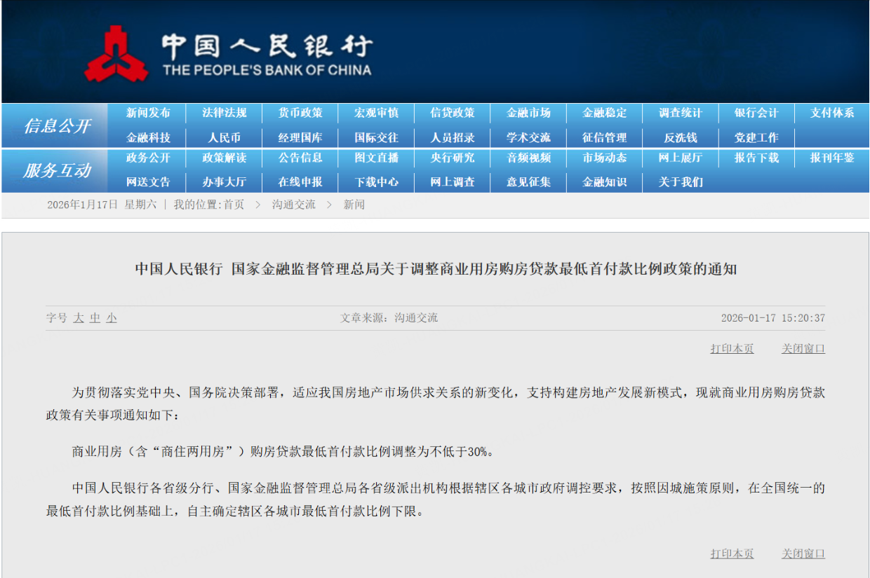 1月17日,中国人民银行、国家金融监督管理总局1月17日联合发布通知称,商业用房(含“商住两用房”)购房贷款最低首付款比例调整为不低于30%。