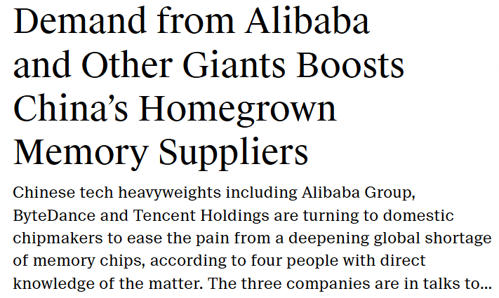 3月5日,据The Information援引知情人士报道,阿里巴巴、字节跳动和腾讯转向国内芯片制造商,以缓解日益严重的全球存储芯片短缺带来的压力。据悉上述公司正洽谈从两家中国公司采购更多标准存储芯片(即DRAM)和NAND闪存。报道称,过去几个月,阿里巴巴、字节跳动和腾讯向三星电子和SK海力士寻求更多芯片供应。
