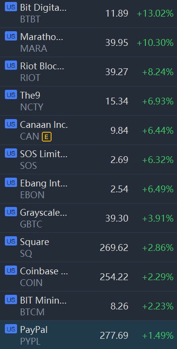 Crypto stocks surged in morning trading.Bit Digital,Marathon Digital,Riot Blockchain,SoS Ltd,Square,Coinbase and Paypal climbed between 1% and 13%.