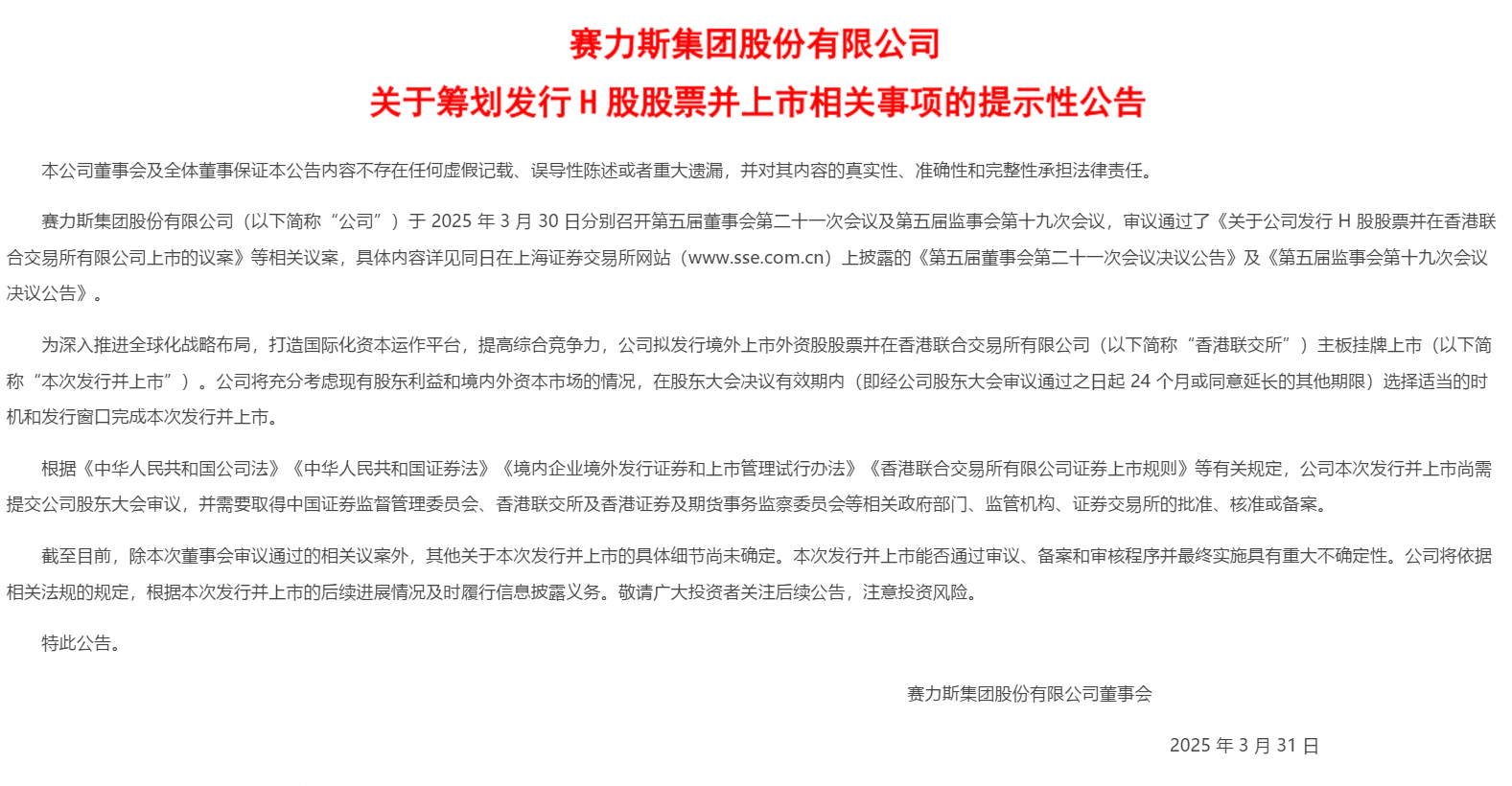 3月31日,赛力斯公告称,公司于2025年3月30日召开董事会和监事会,审议通过发行H股股票并在香港联合交易所有限公司上市的议案。公司拟通过发行境外上市外资股股票,在香港主板挂牌上市,以推进全球化战略布局,打造国际化资本运作平台,提高综合竞争力。