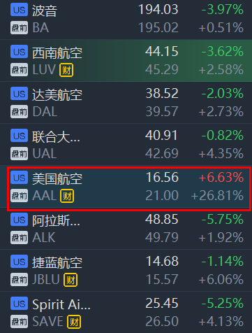 美国航空盘前一度暴涨逾80%,此前在Reddit论坛被提及。