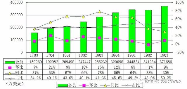 爱奇艺第三季度会员服务收入达到37亿元(约合5.200亿美元),较2018年同期增长30%,占本季度总营收的一半以上。