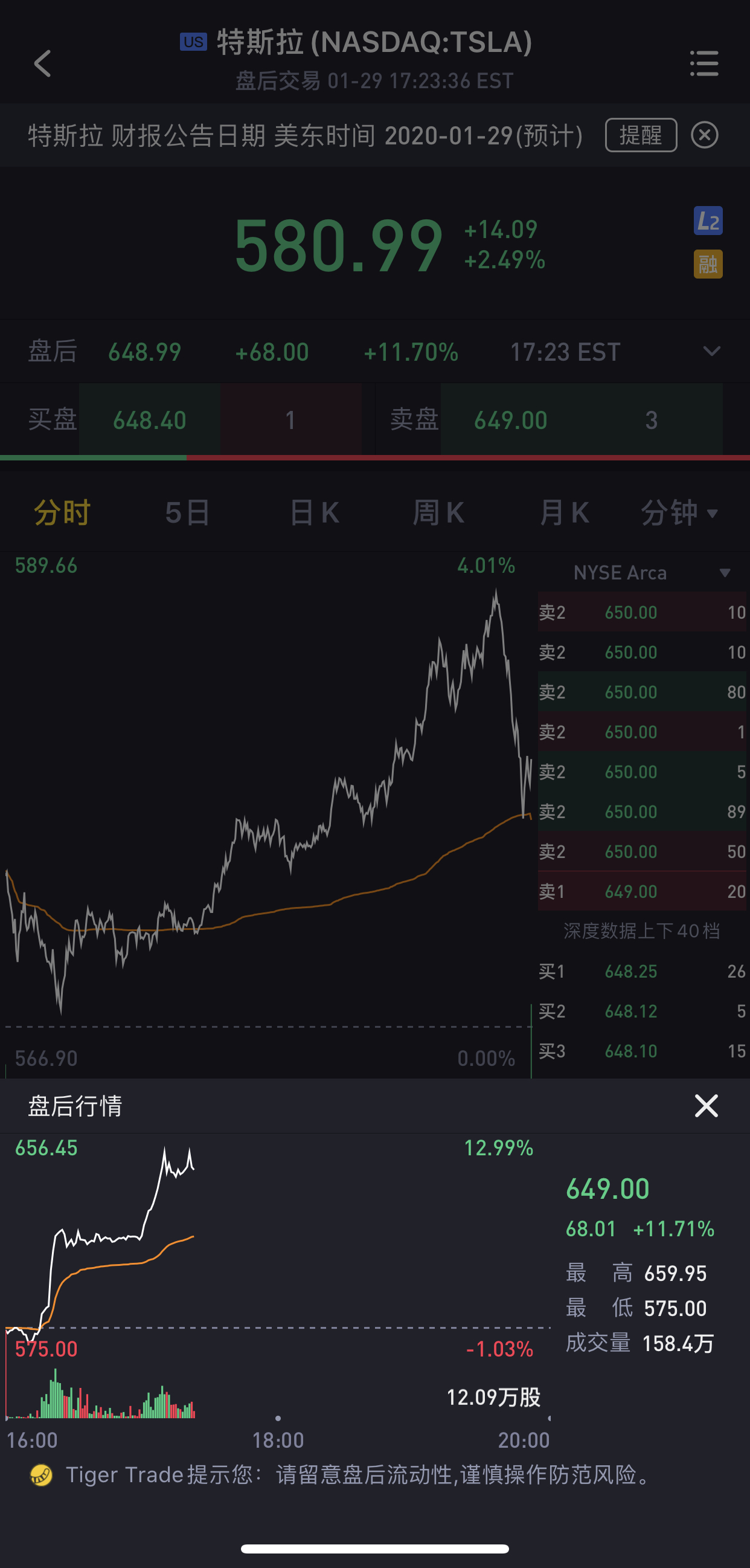 特斯拉在周三常规交易时间上涨2.49%,收盘价为580.99美元;财报公布后,特斯拉盘后大涨逾11%,股价超600美元关口至647美元。特斯拉股价过去12个月以来暴涨94%,市值也突破1000亿美元,超过了福特1999年的市值巅峰,但仍不及丰田。