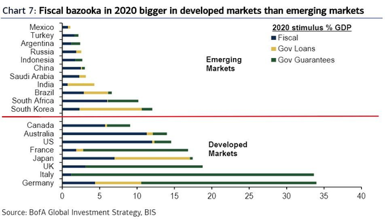 哈特尼特补充说,2020年的美国政府财政刺激将主要有三种形式:政府支出、信贷担保、贷款及股权。国际清算银行(BIS)的数据显示,美国和澳大利亚的政府支出较为突出,所占GDP的比重超过10%,欧洲正在使用激进的信贷担保(例如意大利的信贷担保占其GDP的32%),而日本、韩国则通过政府贷款或股权注资进行经济刺激。