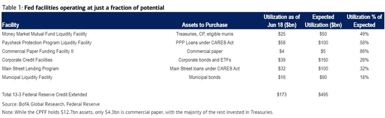 强大的号召力意味着鲍威尔可以轻易击垮市场上的空头。因为美联储的工具箱目前只发挥了很小的一部分力量。如下图所示,美联储在包括PPP贷款、公司债计划、主街贷款计划等潜在的4950亿美元“弹药库”中,目前只花了1730亿美元。而且美联储再次扩充“弹药”的可能并不是没有。