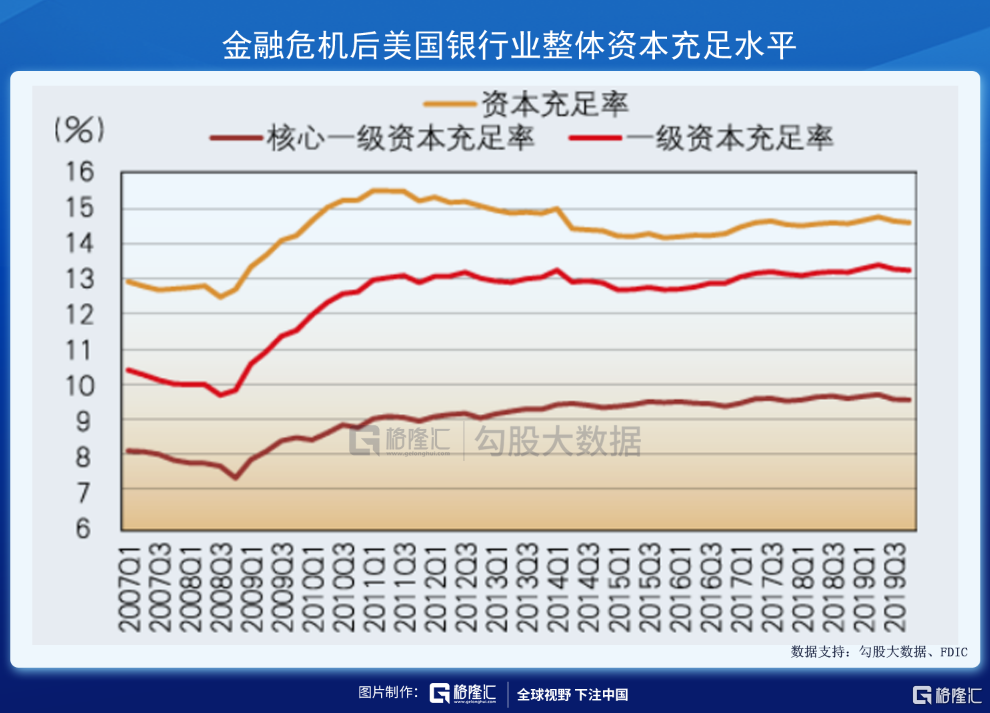 随着美国经济复苏,美国银行通过扩大利润留存主动增加资本,核心一级资本充足率从2008年的7.5%上升至2019年的9.7%,增幅为30%,总资本充足率从2008年的12.8%提升至2019年的14.6%。