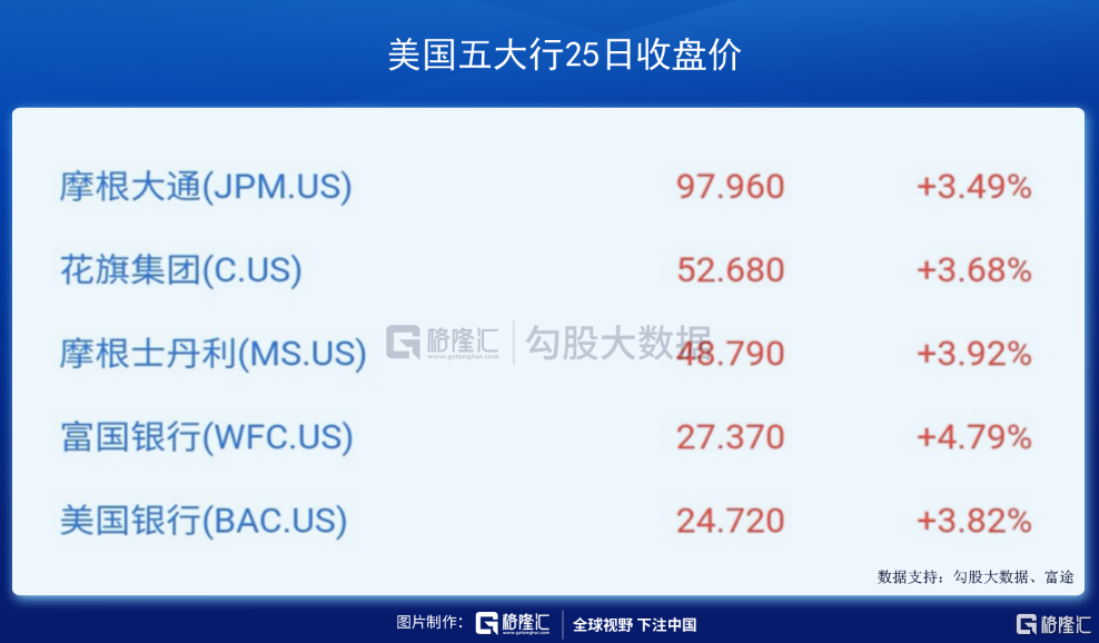 消息一出,美国银行股集体走高,摩根大通花旗集团、摩根士丹利富国银行、美国银行收盘涨幅均超3%。