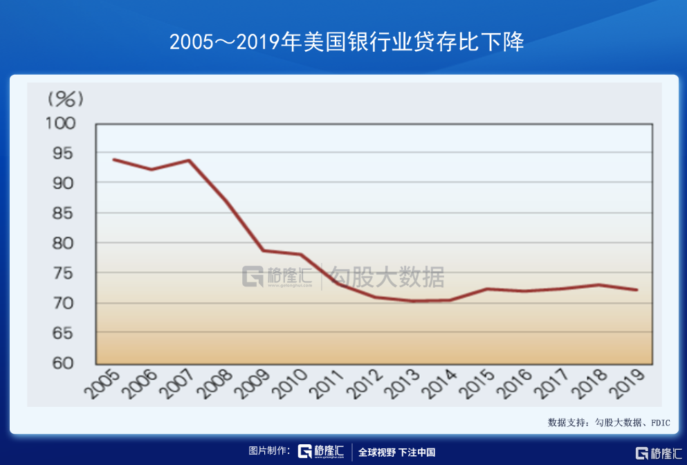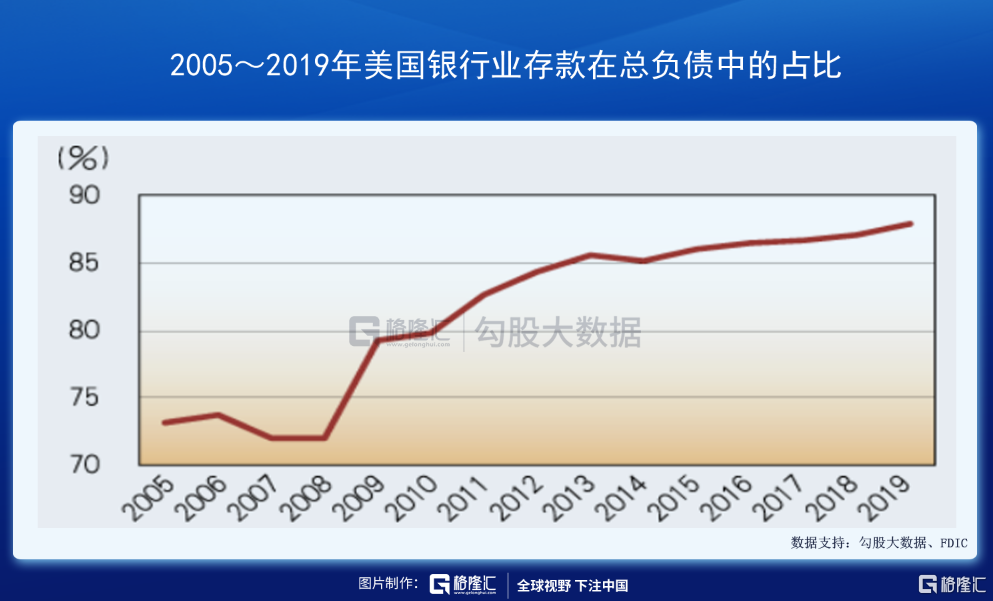 截至2019年,美国银行业存款在总负债中的占比高达88%,较2008年的72%大幅提升16个百分点。